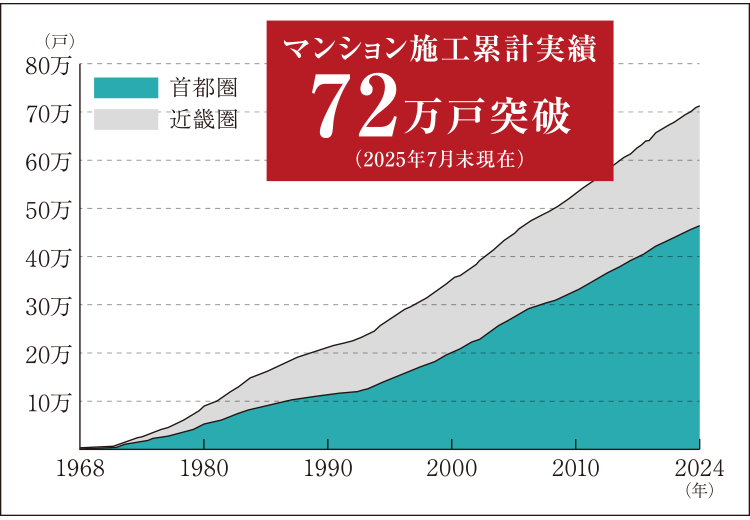 1969年にマンションを手がけて以来、累計施工実績は2025年に72万戸超に。この数は日本の分譲マンションストックのおよそ1割に相当します。当社の強みは、販売・管理・修繕を展開するグループ会社から得たお客様ニーズを、事業提案・設計・施工にフィードバックできる事業体制にあります。 これからもお客さまの声に耳を傾けながら、より安全・安心で快適なマンション創りに取り組んでまいります。