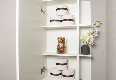 収納力のある奥行き約240㎜を確保したミラーキャビネット。ミラーが手前に近付くため、前屈みにならずにメイクをしていただけます。また正面からは見えないサイドにオープン棚を設け、スッキリとした印象に仕上げました。さらにミラーキャビネットの下段と下部には、充電式の電化製品に便利なコンセントを設置。スライド収納はバスタオルも余裕で片付く、大型サイズとしています。