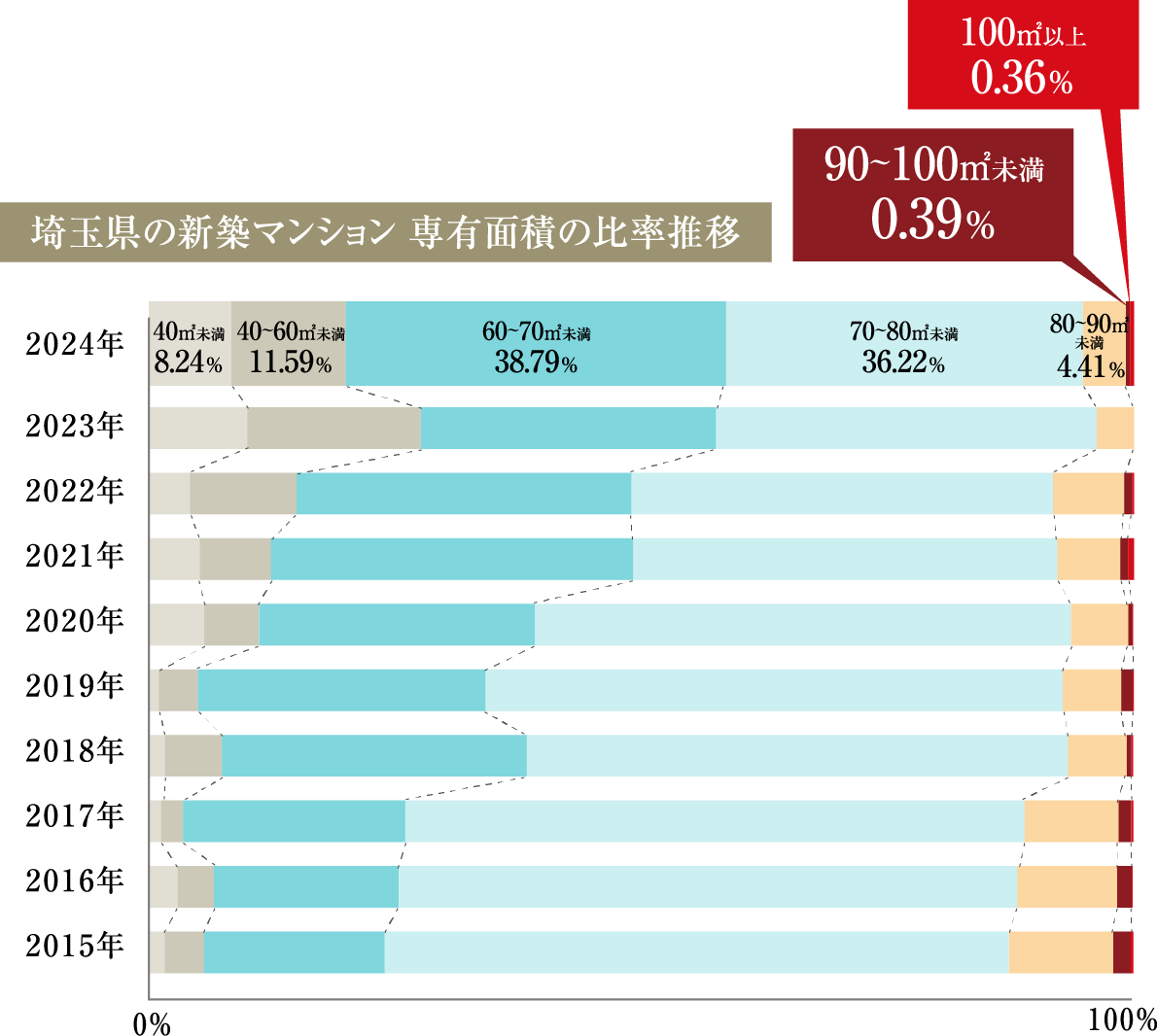 埼玉県でも70㎡以上の割合が2015年75.9%から