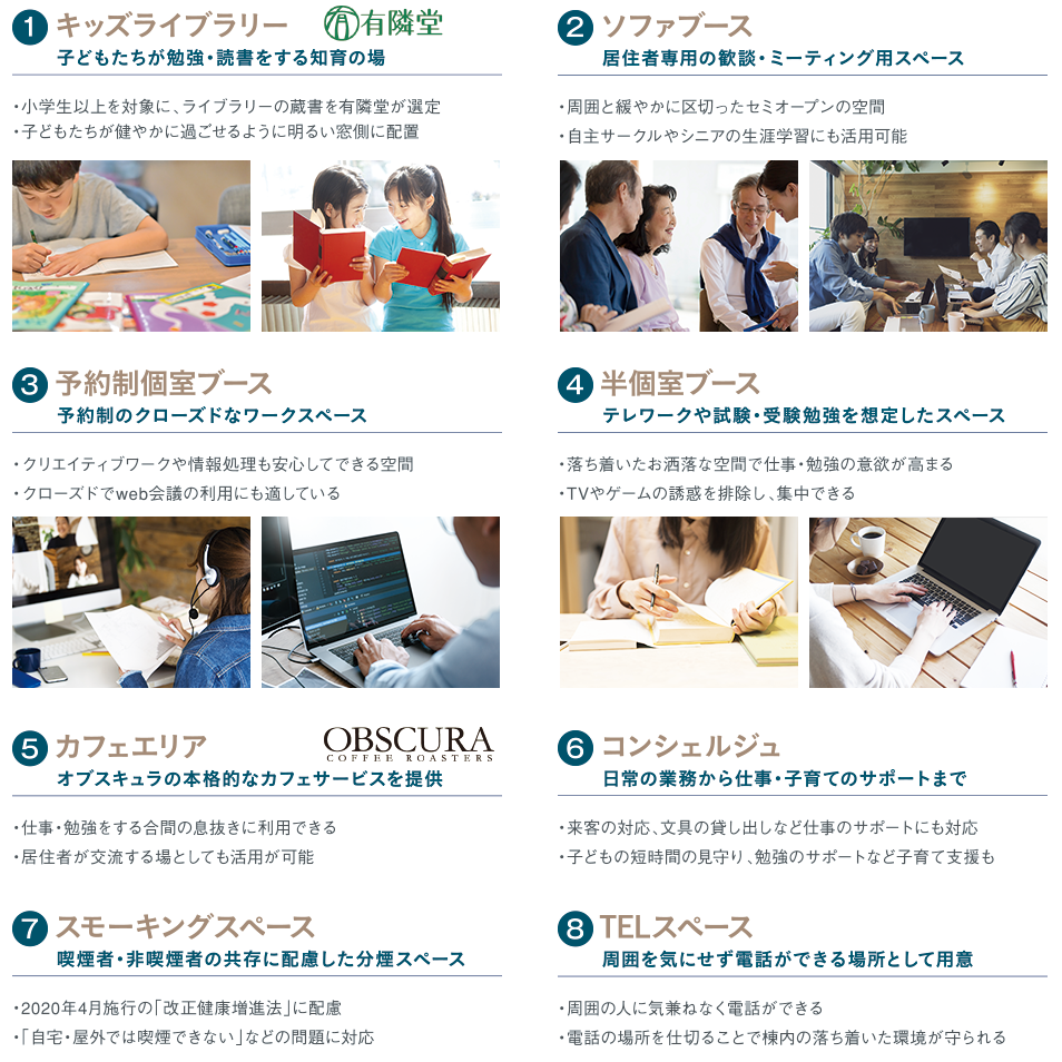 「ザ・ルーフ」では様々な働き方への対応や世代ごとの利用目的、暮らしのサポートなど必要な機能を整理し、棟内を8つに区分。