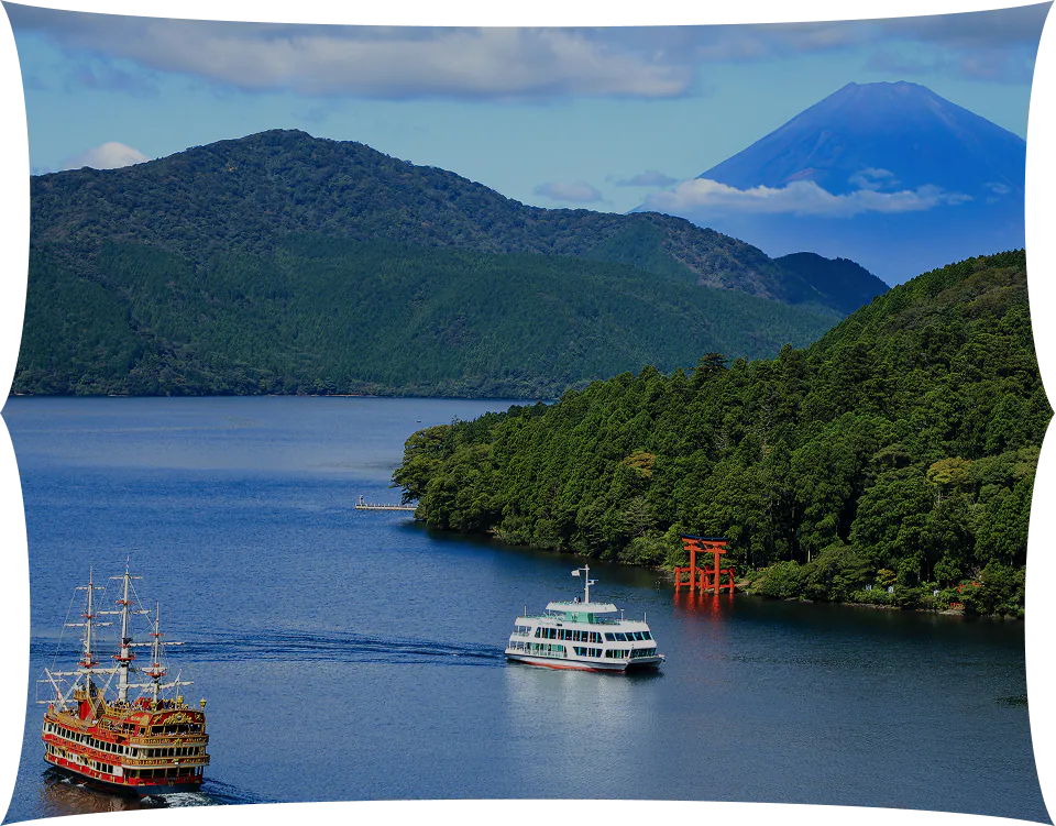 遊覧船が運航され、湖岸には箱根神社や水族館が佇み