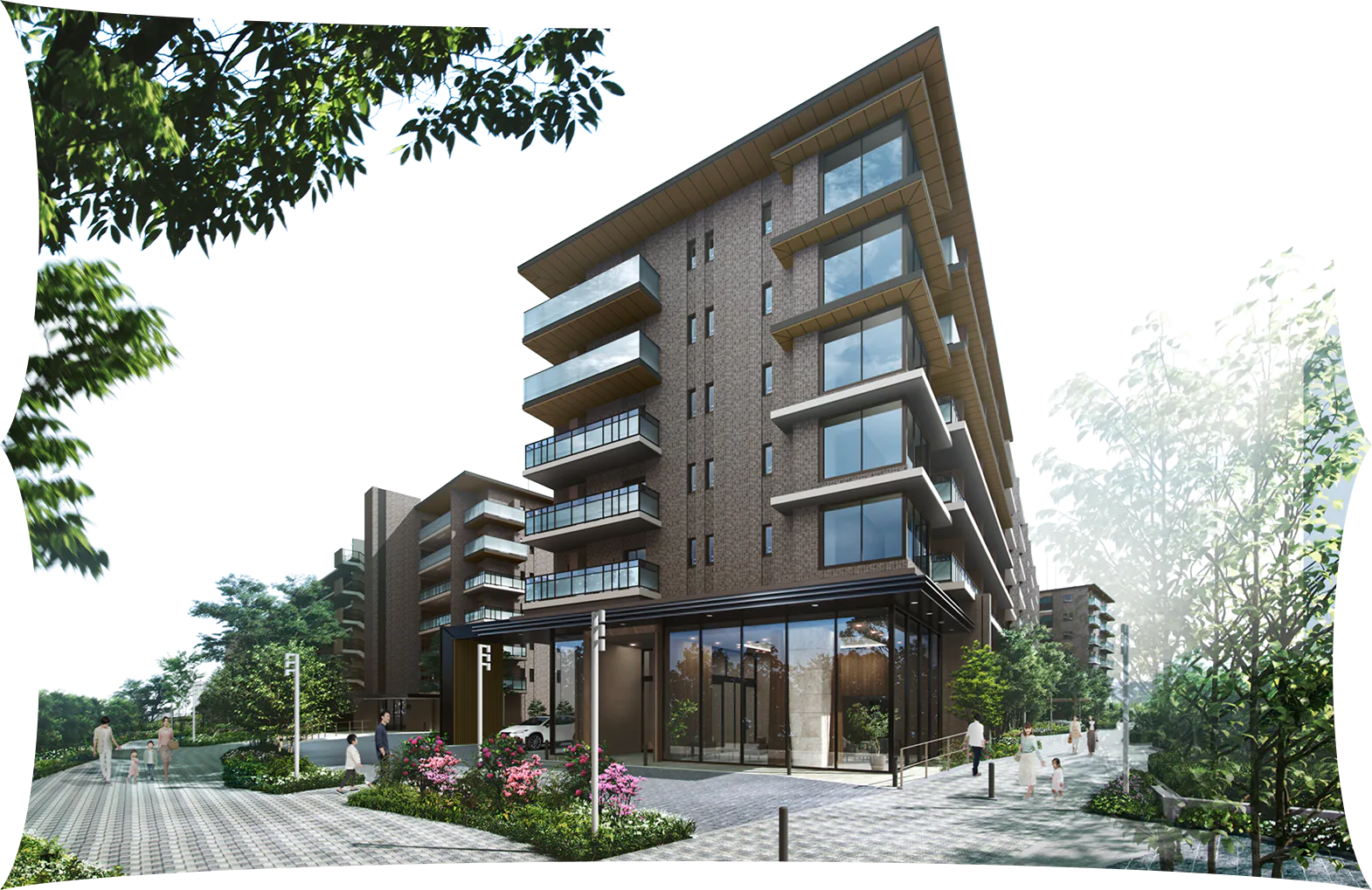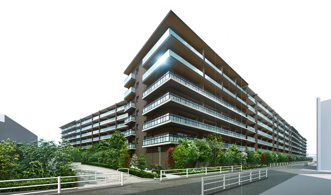 ※掲載の外観完成予想CGは計画段階の図面を基に描いたもので実際とは異なります。また今後変更になる場合があります。なお外観の細部・設備機器・配管類等は一部省略、又は簡略化しております。植栽につきましては特定の季節の状況を表現したものではなく、樹種や本数は今後変更になる可能性がございます。竣工時には完成予想図程度には成長しておりません。