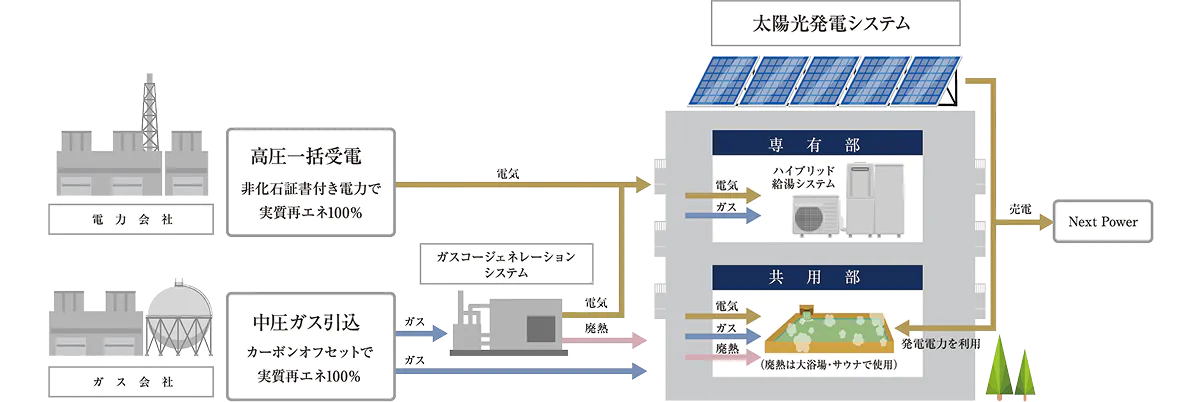 建物屋上に太陽光発電パネルを設置し、発生した電力を活用し、共用部の電力として利用。残りの余剰電力を売電することで月々の電気代が安くなる予定です。