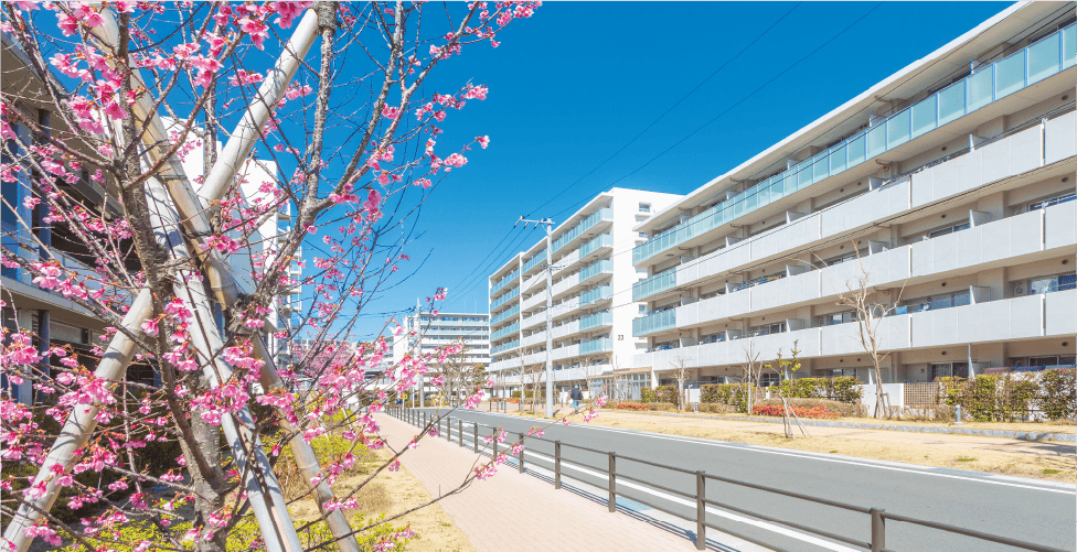 現地の目の前は「柏」駅からの主要なアクセス部として豊四季台の新しい顔を印象づける街路空間を形成します。沿道の建物の高さを制限して統一し、さらに建物をセットバックさせてゆとりある街並みを形成。既存樹の保全に努め、高低差を活かした印象的な緑化空間を演出します。