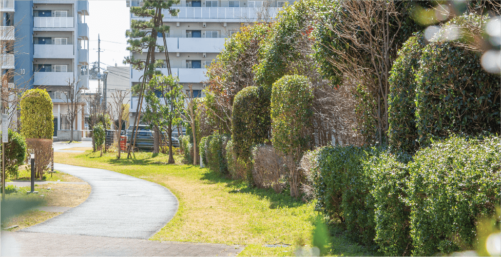 豊四季台の街の中心を周回する「四季のみち」はゆとりある歩行者空間を創出。歩行者通路の幅員は2m以上を確保。同時に通路沿いの植栽等も2m以上確保することを目指して四季を感じる樹種を配し、集いや憩いのスペースの配置に配慮しながら地域をつなぐ緑道を形成します。(一部未整備)