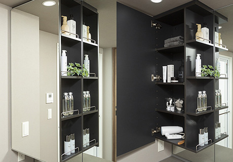 収納力のある奥行き約240㎜を確保したミラーキャビネット。ミラーが手前に近付くため、前屈みにならずにメイクをしていただけます。また正面からは見えないサイドにオープン棚を設け、スッキリとした印象に仕上げました。さらにミラーキャビネットの下段と下部には、充電式の電化製品に便利なコンセントを設置。スライド収納はバスタオルも余裕で片付く、大型サイズとしています。