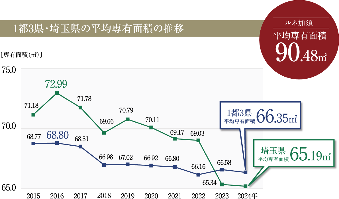 埼玉県でも70㎡以上の割合が2015年75.9%から
