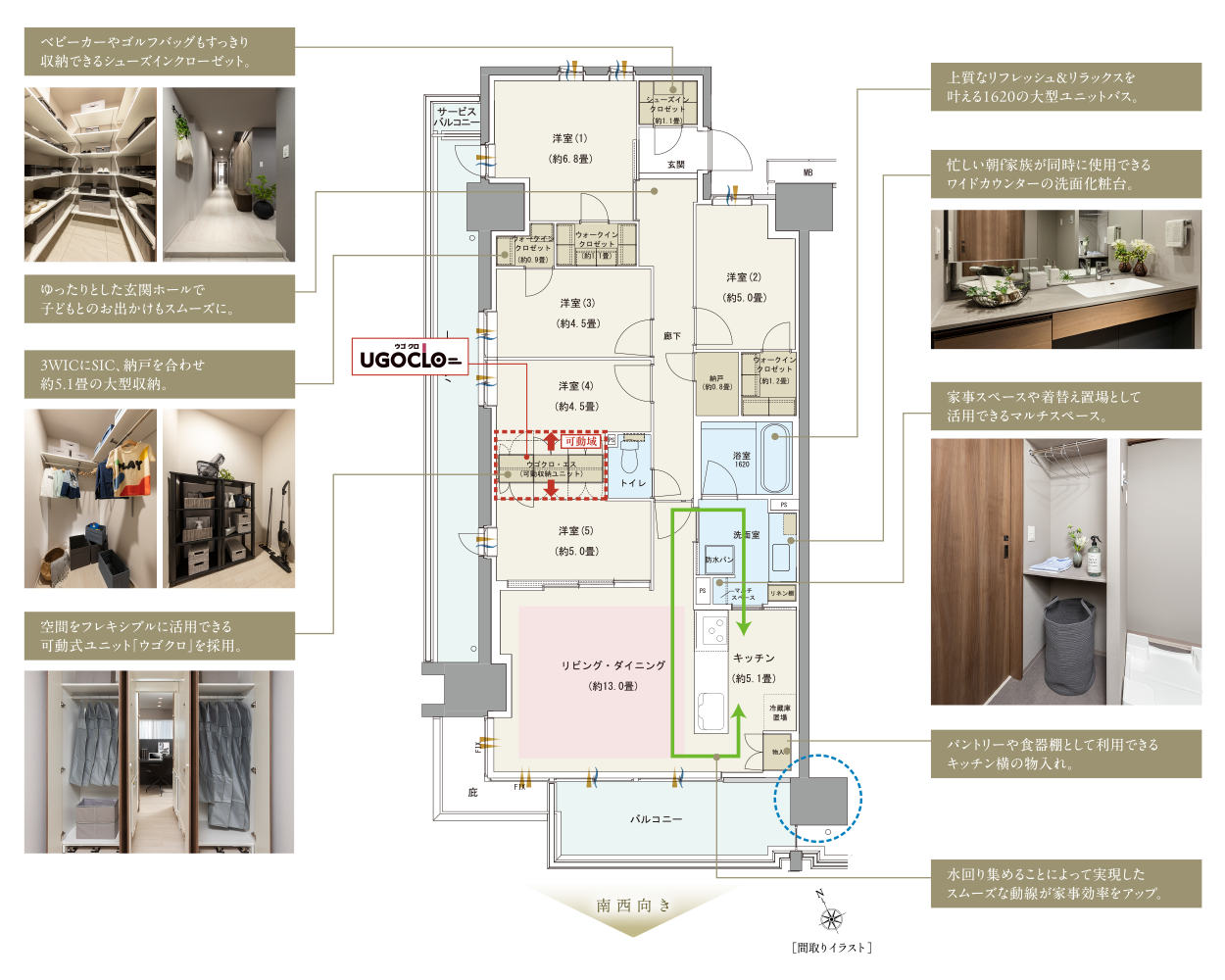 Aタイプは102.93㎡・5LDK。 キッチン~洗面室~リビング・ダイニングが 回遊型動線になっており、家事効率も高まるでしょう。 収納も100㎡超ならではの充実ぶり。 3つのウォークインクロゼット、シューズインクロゼット、 納戸を合わせると約5.1畳。 これに可動収納ユニット「ウゴクロ」も採用され、 子どもの成長に合わせて、収納を広げることもできます。 家族それぞれが専用の収納スペースを持ち、 自分のものが自分で管理できる。 片付きやすい住まいになると思います。