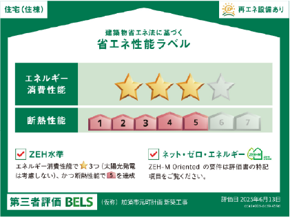 BELS(ベルス)とは、第三者機関によって全ての建築物を対象とした、省エネルギー性能等に関する評価・表示を行う、建築物省エネルギー性能表示制度です。本マンションでは、断熱性の向上や高効率設備の導入などによってエネルギー消費性能で星3つ、断熱性能で5ランクの評価を取得しています。本表示は「住棟全体」の評価であり、「各住戸」の性能を保証するものではありません。