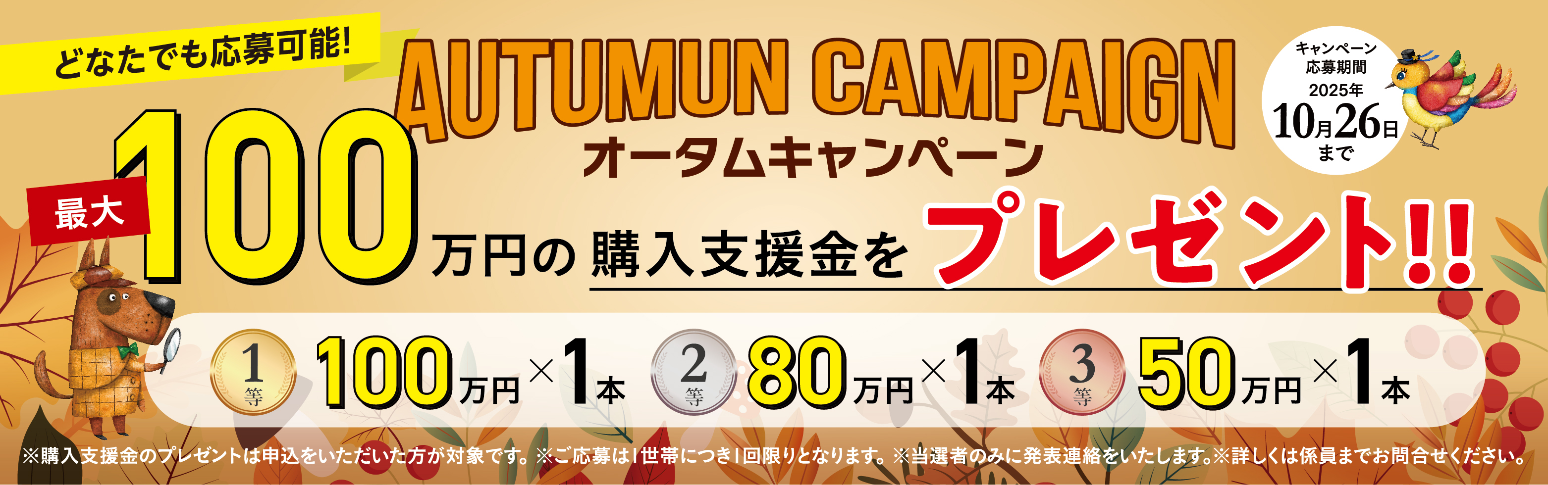 ※必要事項を全てご記入の上、2025年9月30日(火)までにご契約いただいた方を対象といたします。※お祝い金につきましては、ご成約のお客様がお引渡しを受けて頂いた後、双方指定の口座にお振込みいたします。※他のキャンペーン、割引制度との併用はできません。※ご成約お祝い金は雑所得となります。お客様の事情により確定申告が必要となる場合がございます。(詳しくは管轄税務署にご相談ください。)
