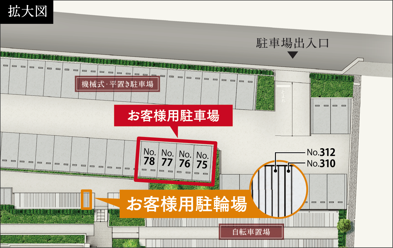 お車のお客様敷地内駐車場No.75〜78をご利用ください。